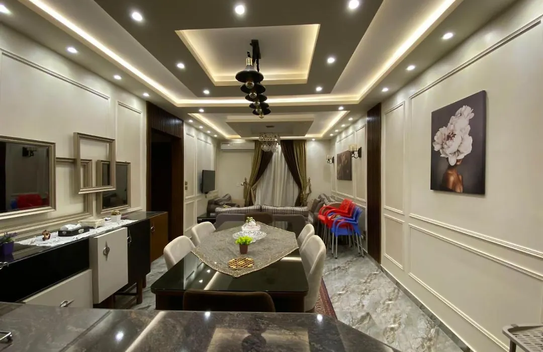 A microwave oven, an electric kettle, and a refrigerator can be found in a fully equipped kitchen. Cairo International airport is 15 km from this apartment. There is a terrace as a spot to unwind.